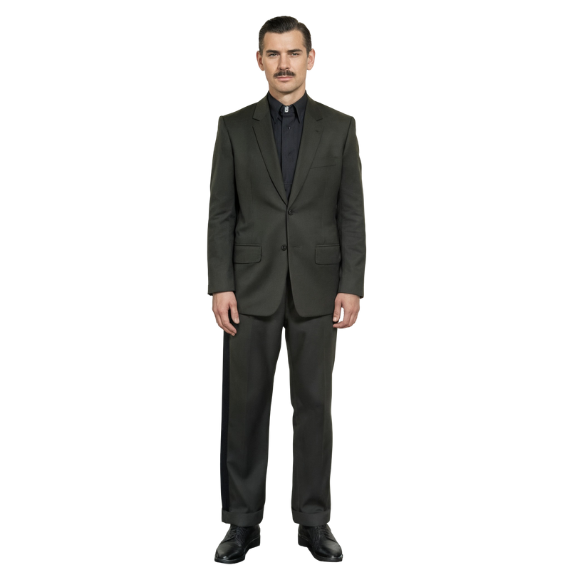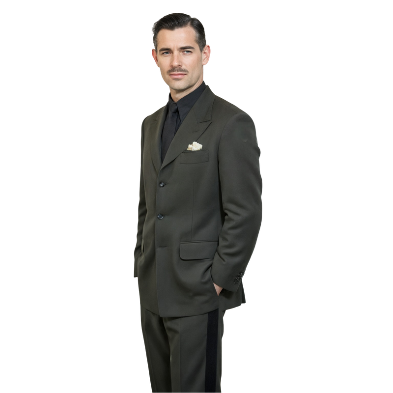 A pair of deep slate pants with an exaggerated black tux stripe and crisp cuff, built for the lounge lizard who favored martinis over meetings and always left the club just before dawn.