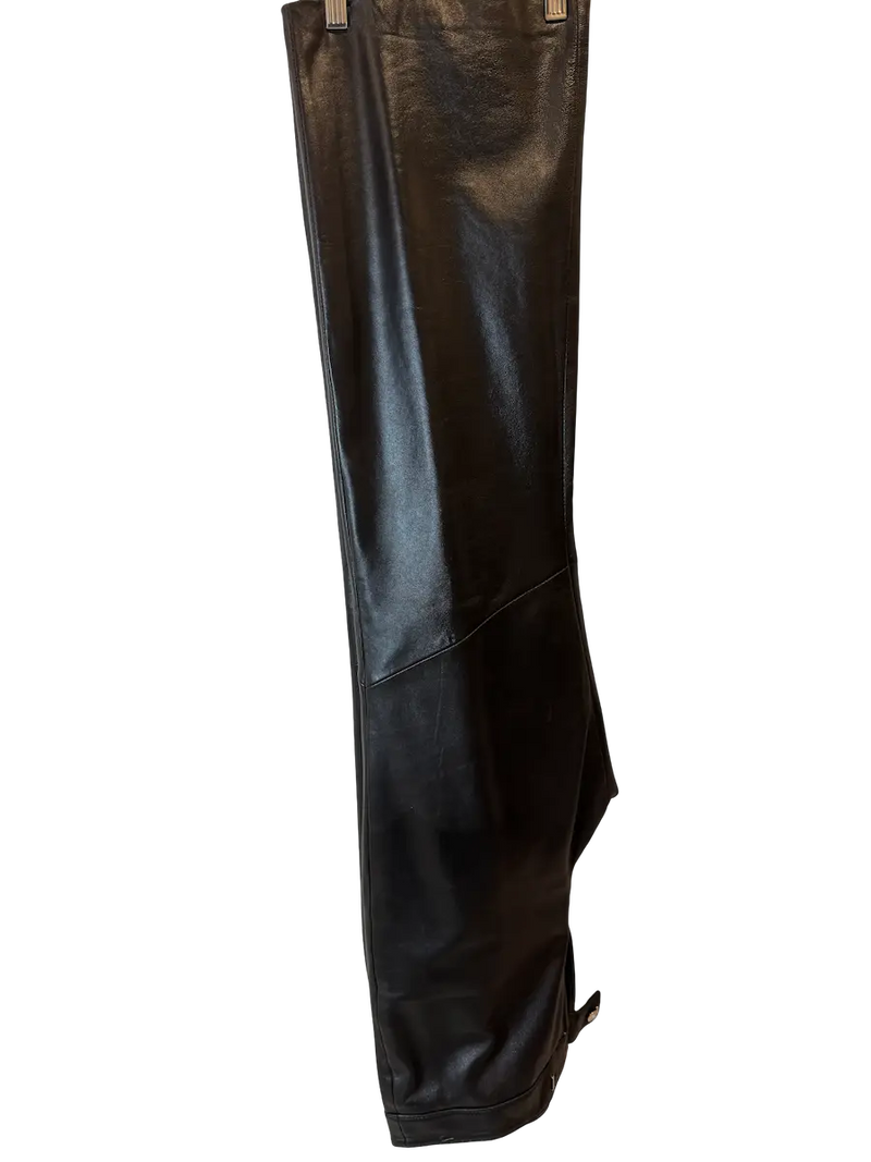 Luxe black faux-leather pants with hardware detail, perfect for rooftop parties or late calls to your stylist from a payphone in Berlin.