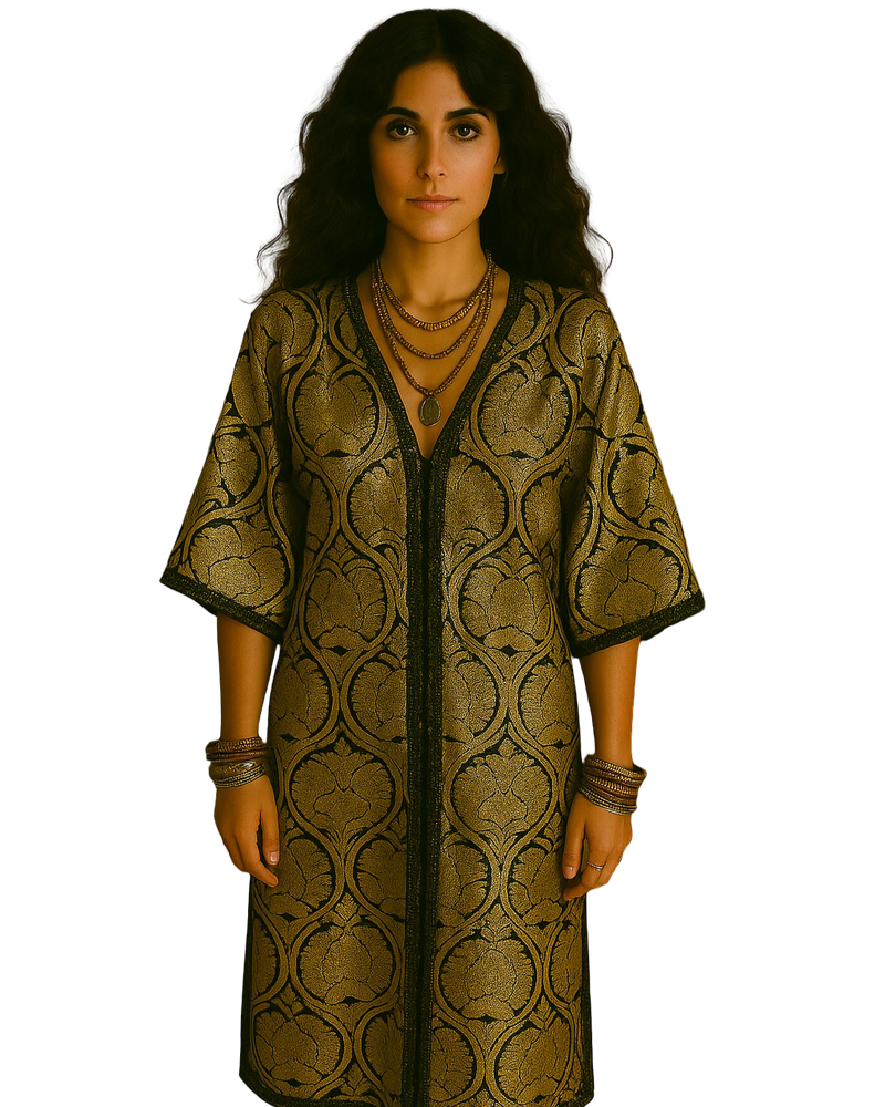 Golden Mirage Kimono – a gleaming tapestry coat woven with lotus medallions and midnight vines, like a lost relic from a caravan of mystics crossing Marrakech at dusk.