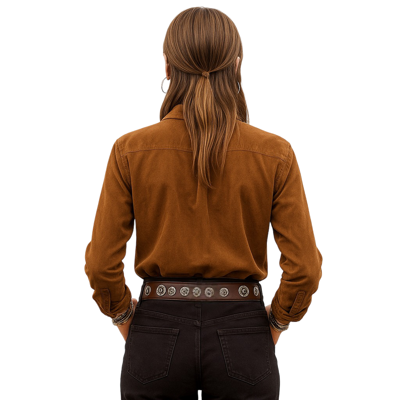 Cedar Drifter Button-Up – a coppery brown shirt with loop-button placket and suede-style collar, made for wood-stove mornings, folk songs, and hitchhiking east of Taos.