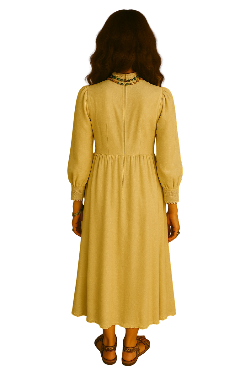 Marrakesh Ceremony Gown – an ethereal ivory prairie dress with a high lace collar, velvet flocking, and ornate trim, echoing the mysticism of desert weddings and candlelit salons in Tangier. A true vintage relic steeped in romance and ritual.