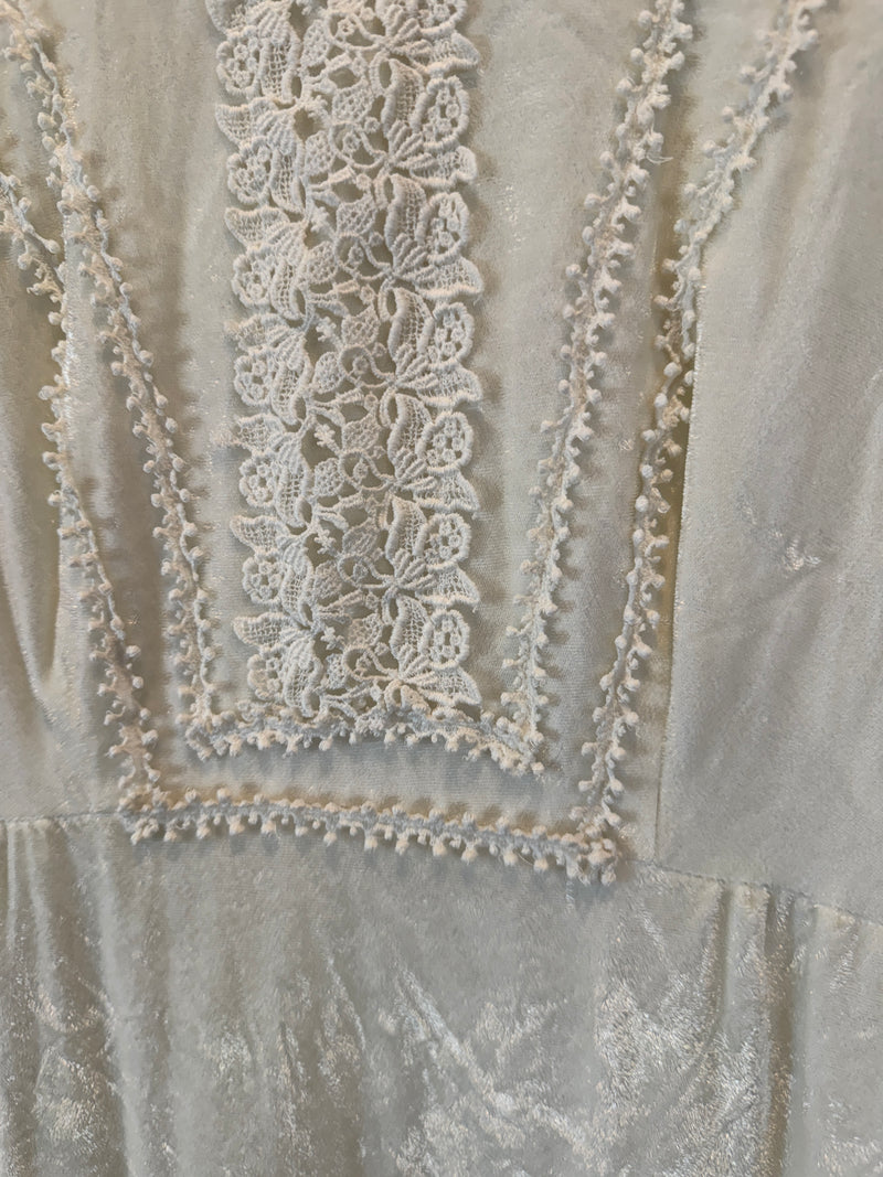 Likely rayon or satin blend with lace accents. Textured with soft body and subtle sheen. Vintage construction, possibly handmade or small-label bridal origin.