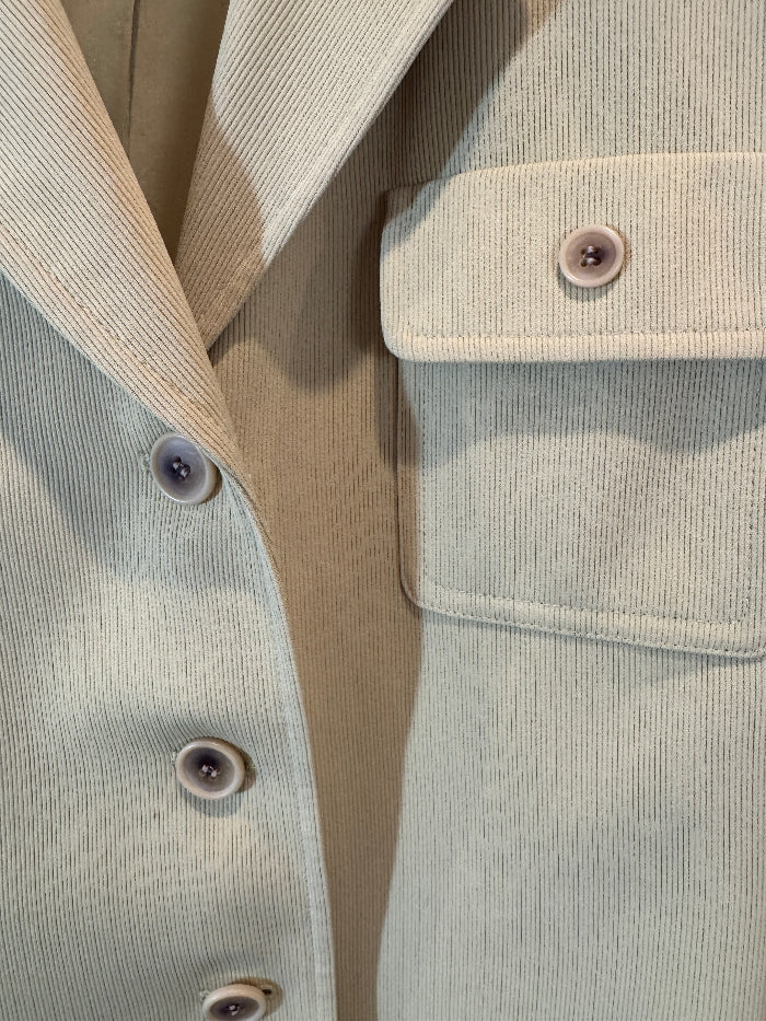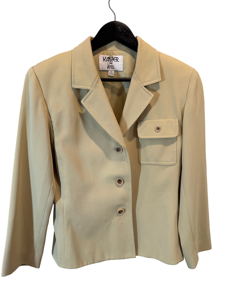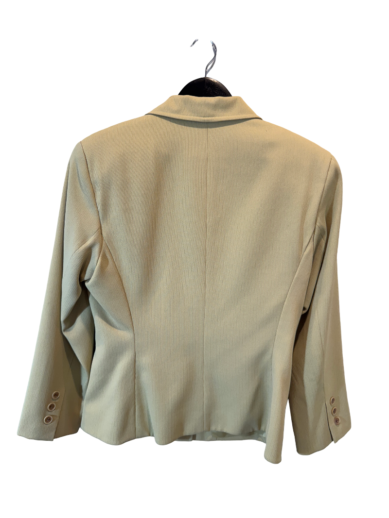 Negotiation Hour Jacket – a buttercream tailored blazer with a chest pocket flap and 3-button front, built for impromptu settlements and decisive lunch meetings.