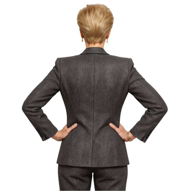 Roseland Realness Blazer – a rich tweed single-button jacket with strokes of pink and turquoise over graphite, sharp enough to kill a bill on arrival.