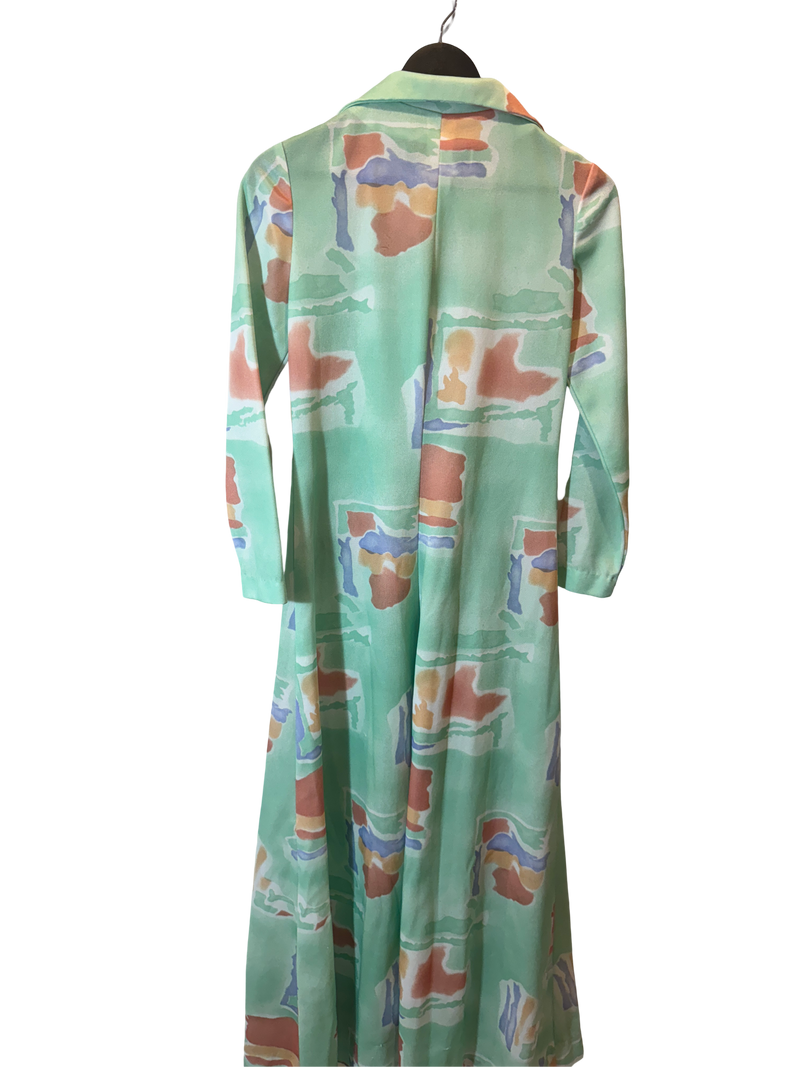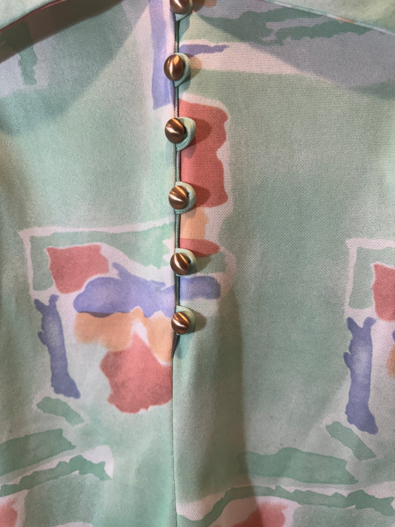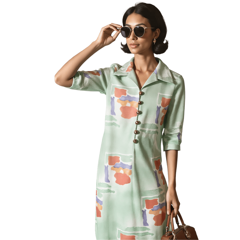 Green Abstract Button Dress– a playful 1970s skirt and blazer set in pastel mod geometrics, nodding to the bold graphic design that took over boutique hotels and Riviera lounges.
