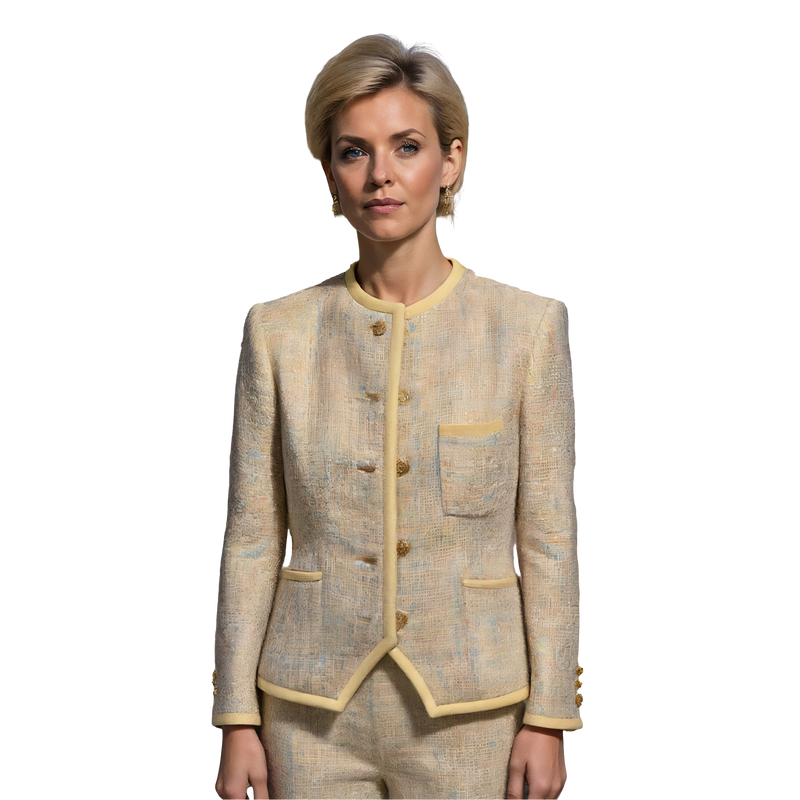 Lemon Veto Jacket – a pastel yellow tweed jacket with golden buttons and raw hemline detailing, spun for council speeches and summer subpoenas.