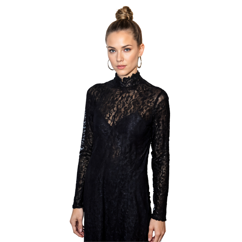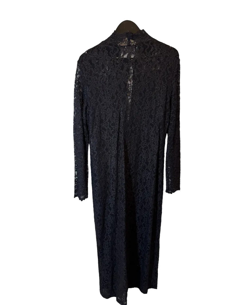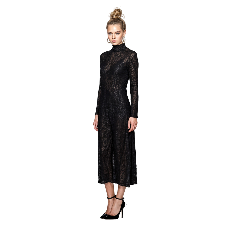 A mysterious full-length lace duster in inky midnight black, echoing the elegance of backstage dressing rooms and late-night hotel rendezvous.