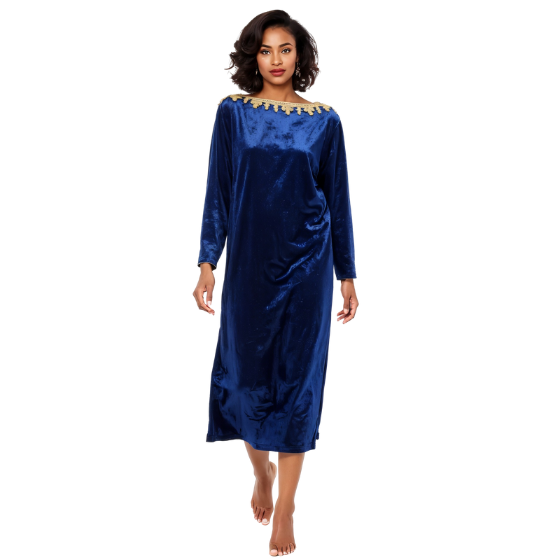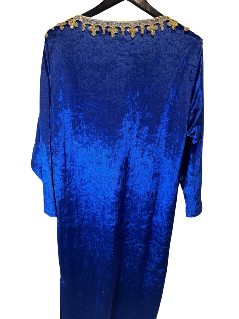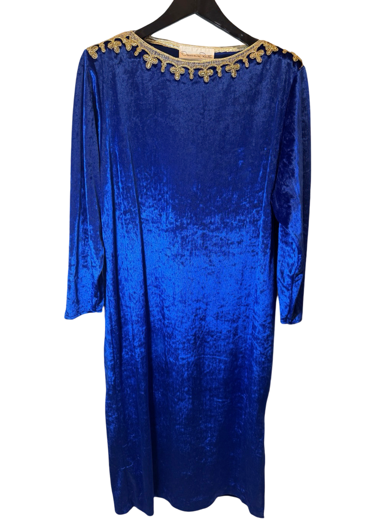 1960s Oscar de la Renta Velvet Gown – A regal, deep-blue velvet gown adorned with intricate gold detailing, made for commanding attention on stage and in elite social circles.