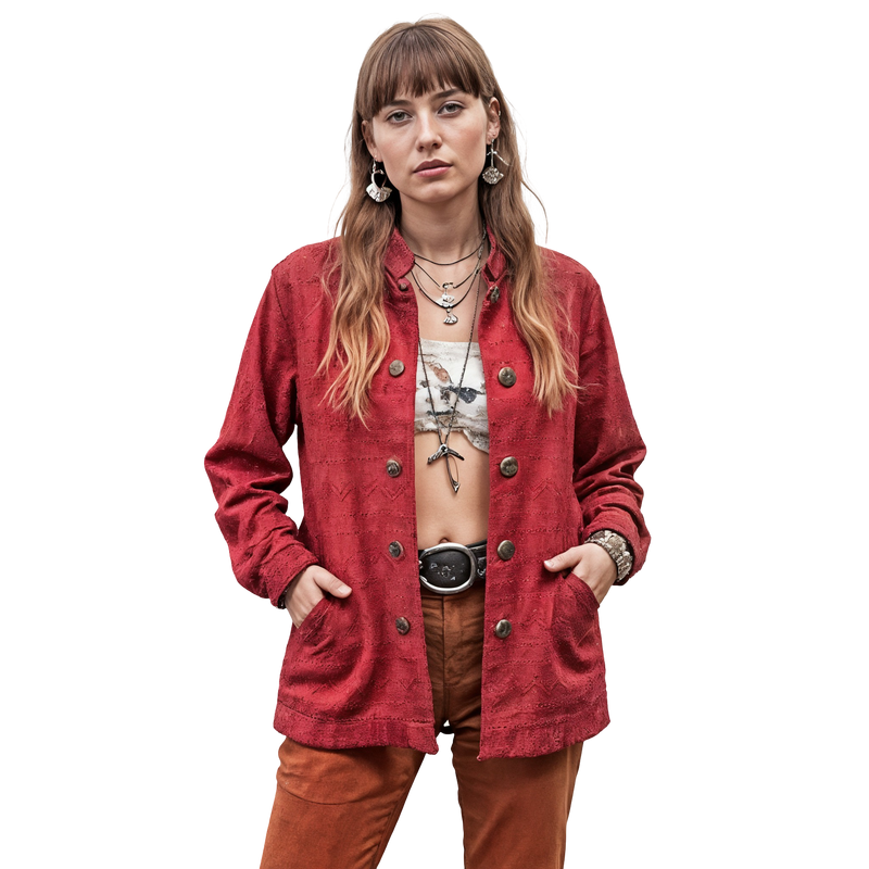 Firelight Gypsy Jacket – a crimson openwork button-up in geometric embroidery, worn to sing poetry by candlelight, stir lentils over campfires, and dance barefoot under lantern moons.