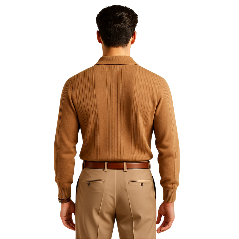 The Capri Marina Polo – this 1960s long-sleeve polo features a soft caramel knit and subtle cable texture, evoking the elegance of early morning walks along the marina and warm espresso at family estates.
