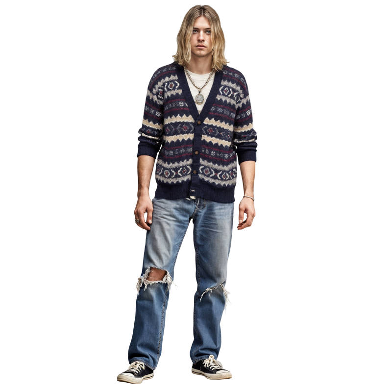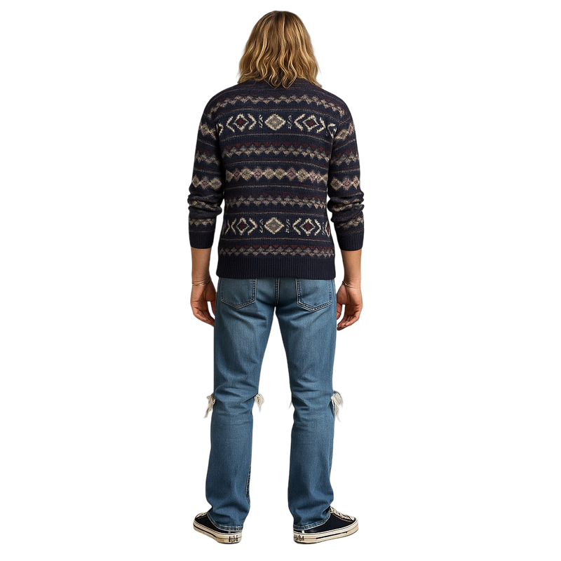 Suburb Broadcast Cardigan – a multicolor Fair Isle knit in night-sky navy and static-glow tones, destined for rainy radio sets and all-night diners.