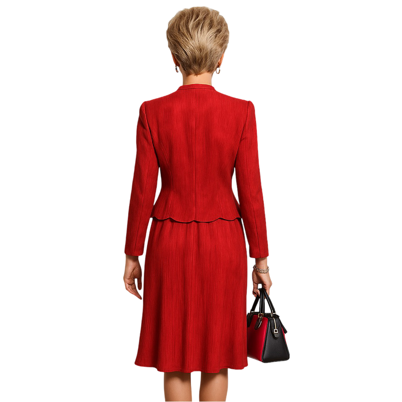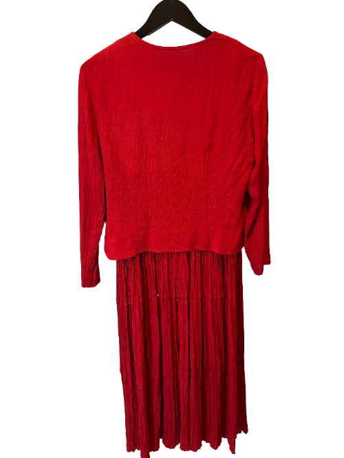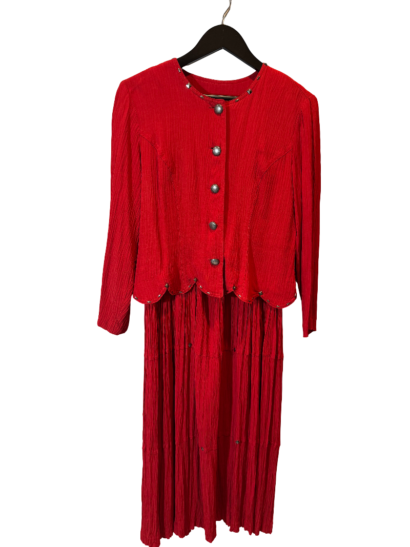 Wall Street Valentine Set – a red pleated power set with silver stud trim and a commanding silhouette, perfect for fielding PR disasters before lunch.