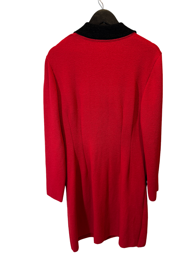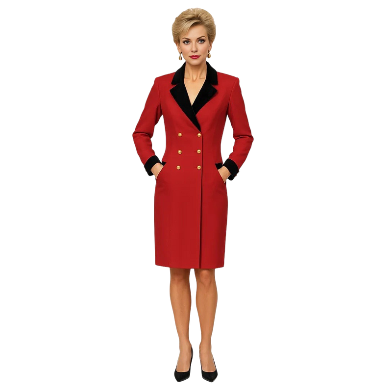 Escada Immunity Coat – an Escada double-breasted wool coat in high-stakes red with velvet contrast trim, made for UN briefings and Fifth Avenue cocktails.