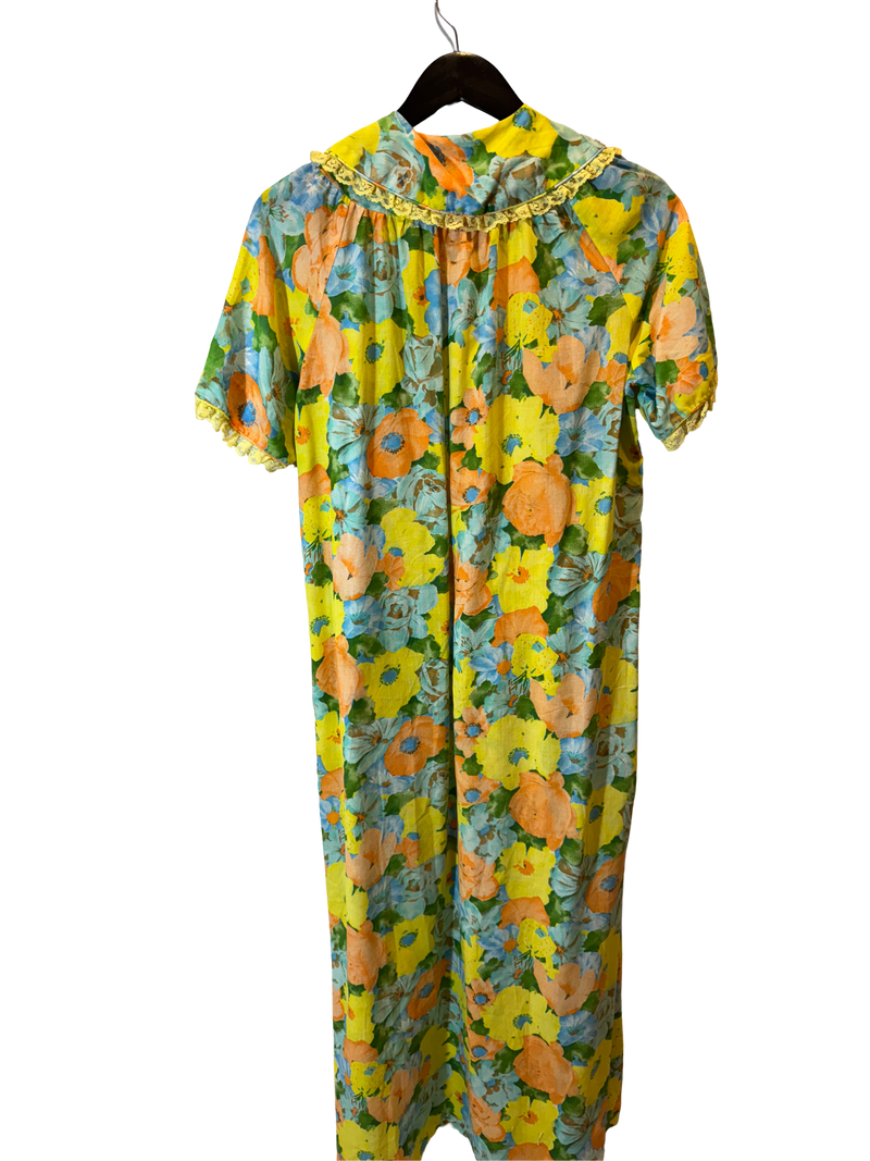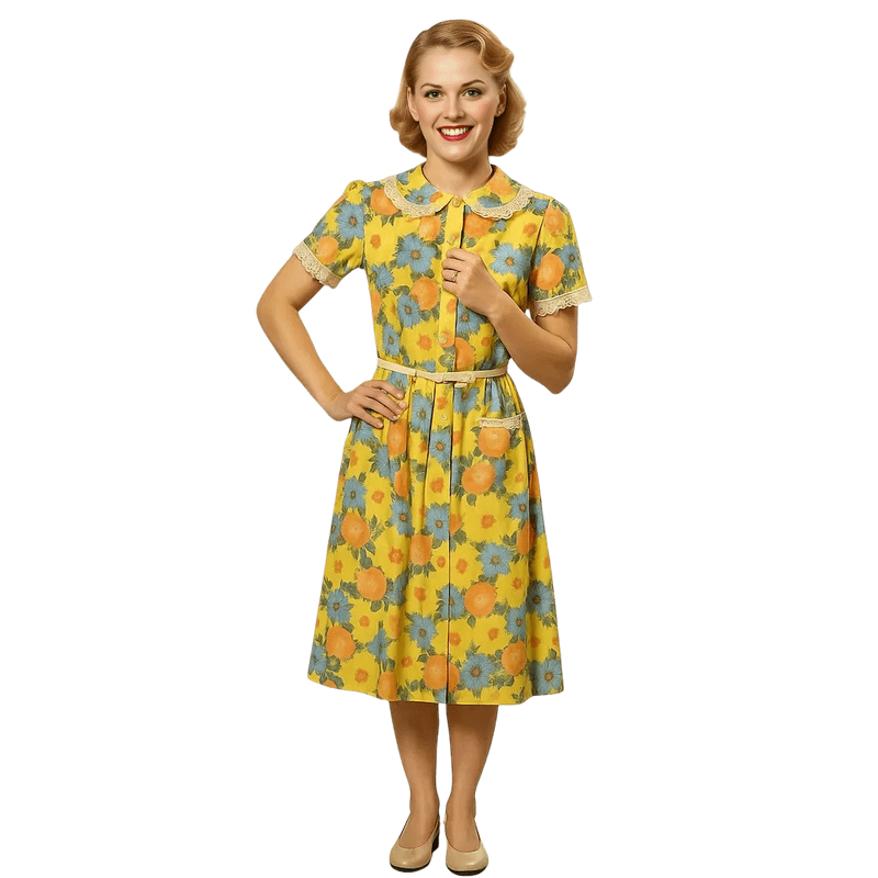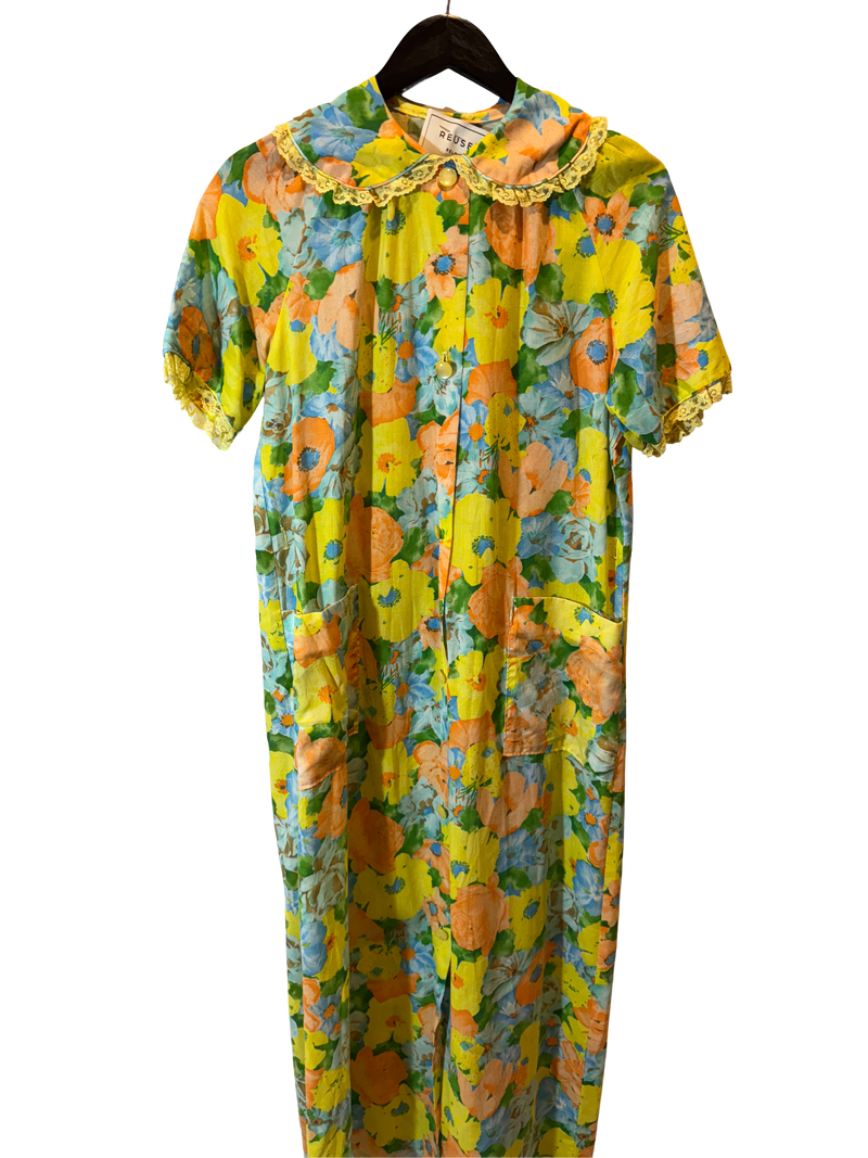Palm Springs Boudoir Gown – a striking 1960s house dress in punchy citrus florals, trimmed with delicate yellow lace at the collar and cuffs. The kind of cheerful domestic elegance worn for poolside entertaining, mid-morning martinis, or answering the door to the milkman.