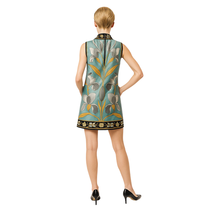 Barbarella Bloom Mini – a floral satin mini in turquoise and citrus tones with bold piping, made for girl-gang winks, mirrored powder rooms, and afterhours mod discos in abandoned art galleries.