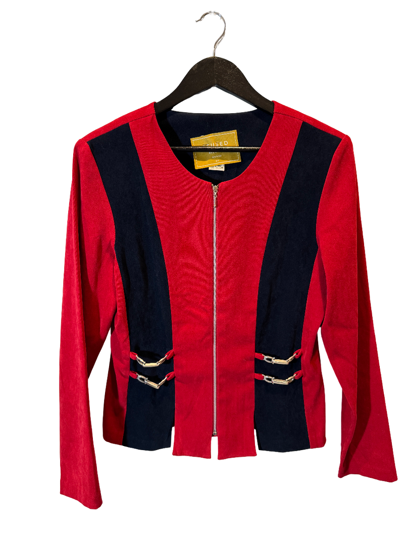 Red bar suit – a colorblocked zip-up jacket in red and navy suede with chrome hook hardware, made for boardroom debates and Soho martinis.