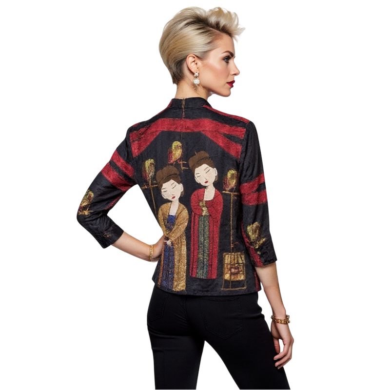 Kyoto Parlor Blouse – a lightweight blouse adorned with hand-painted geisha figures and golden parrots in cages, draped across rich brocade with theatrical red panels. Pure 1980s gallery hostess energy.