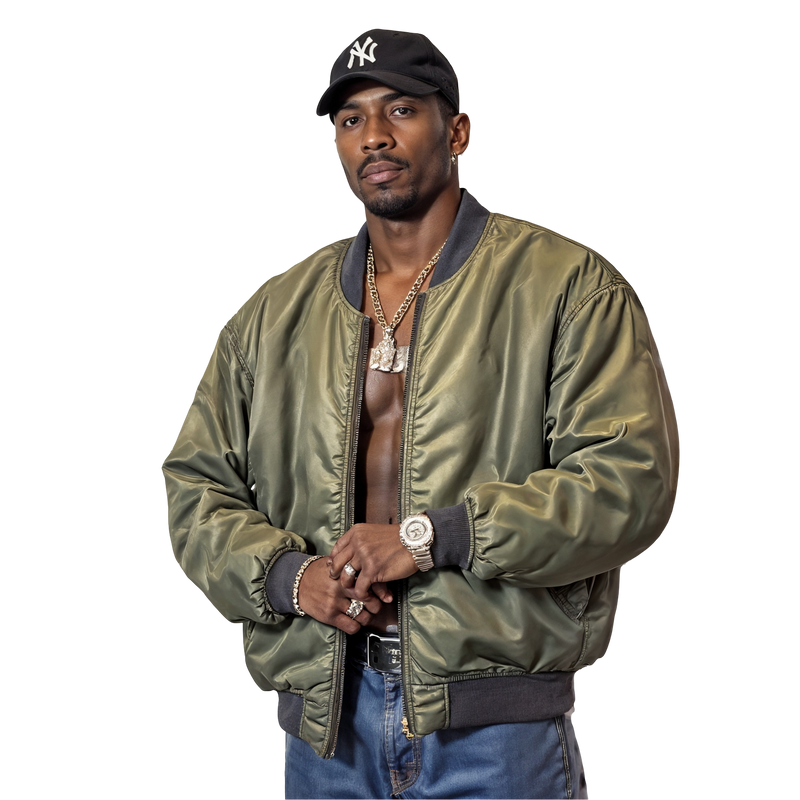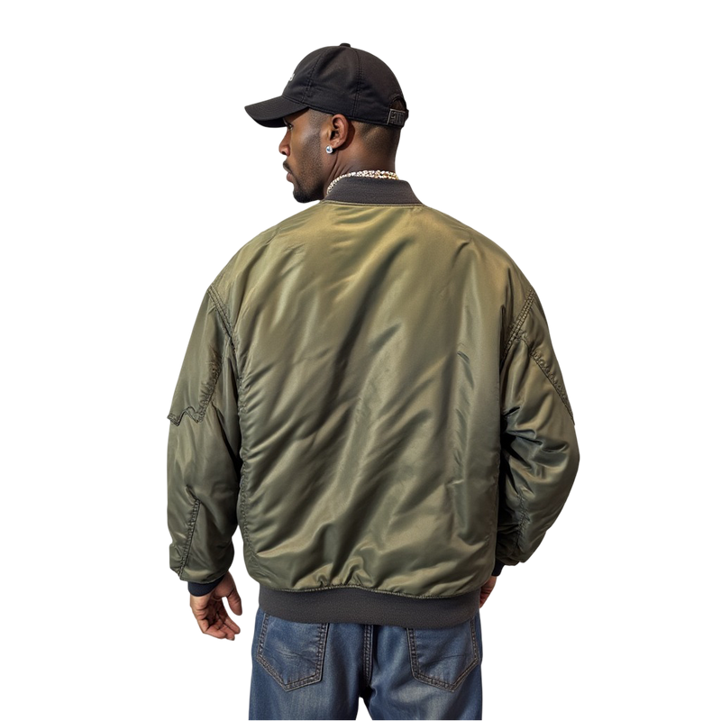 Olive Static Flight Bomber – a heavyweight olive green flight jacket with storm cuffs, bright orange lining, and airbase attitude. Once owned by hip-hop icon Marcus 'Mack' Carter (check his closet), it kept him warm during rooftop freestyles and fogged-up limo rides.