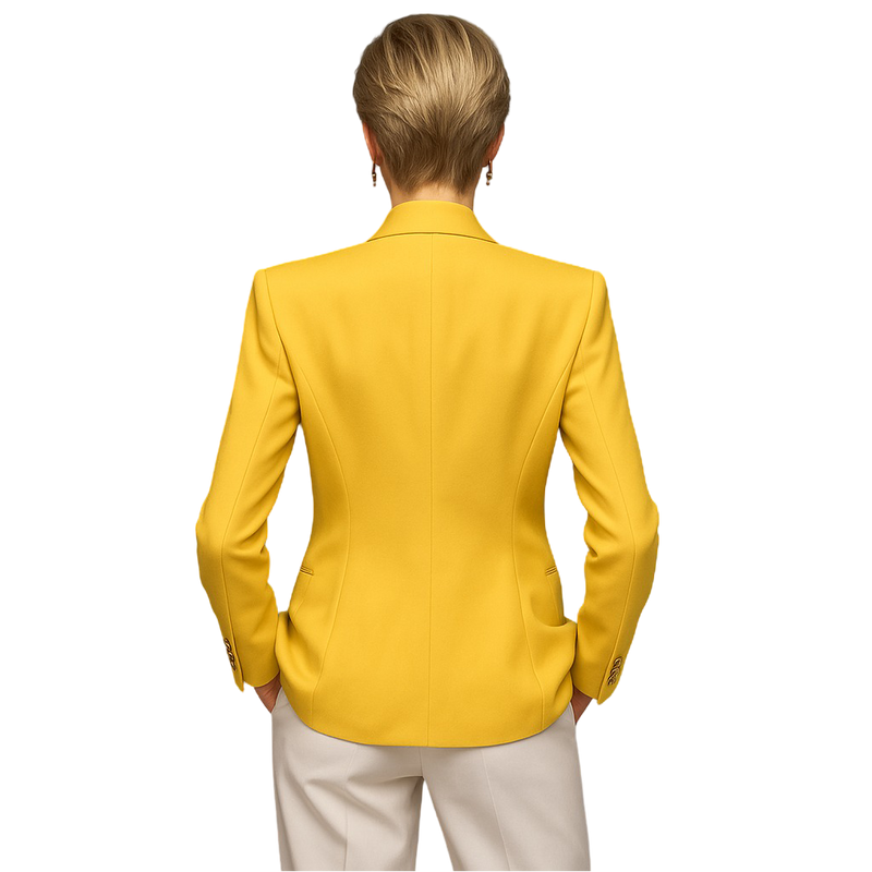 Canary Power Wrap – this bold yellow draped blouse features gold side buttons and a fluid shoulder silhouette that glides like an Emmy acceptance speech.