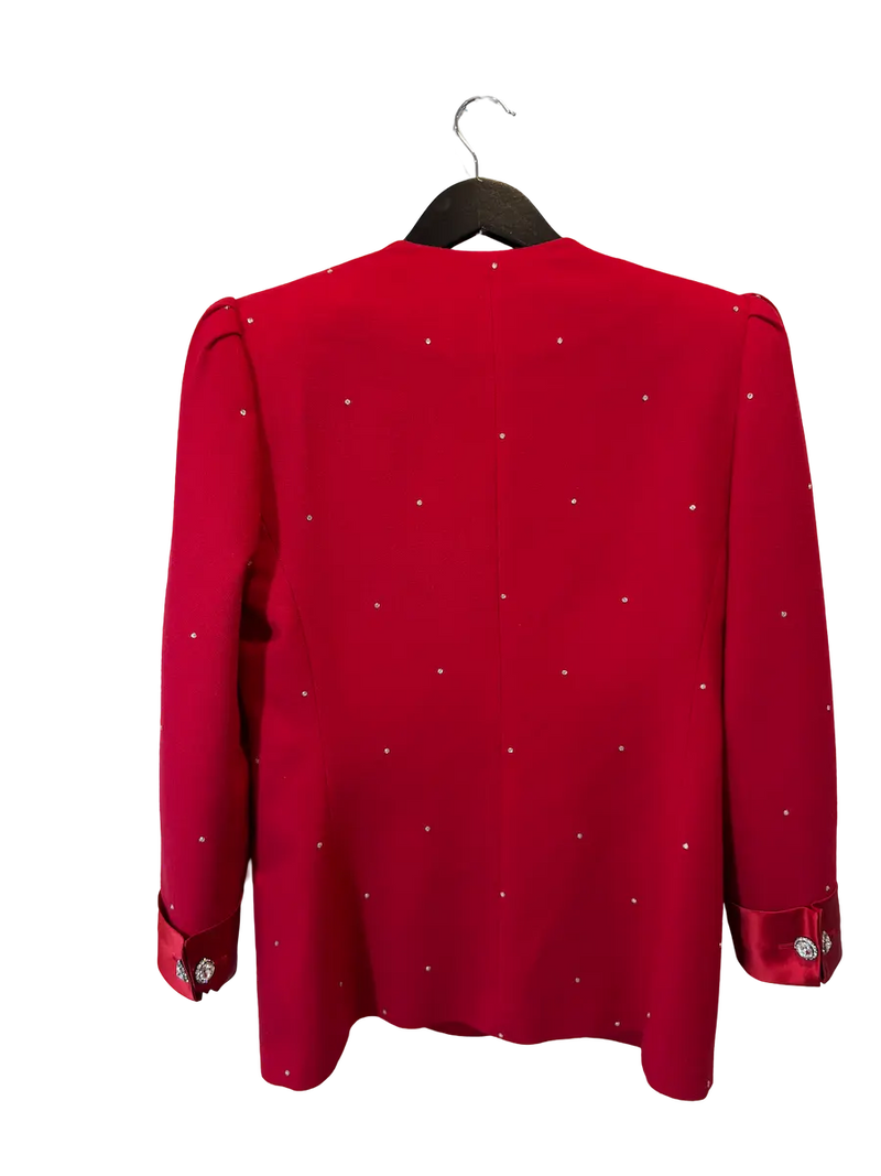 Cherry Strobe Blazer – an electrifying red blazer flecked with rhinestones, like the lighting rig on a dancefloor mid-sax solo.