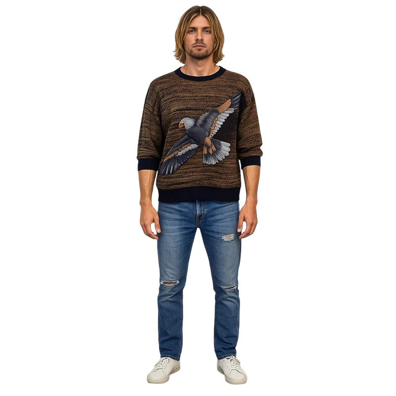 Graveyard Drift Bird Sweater – a brutalist knit featuring a spread-wing hawk across washed-out taupe and navy marled yarn.