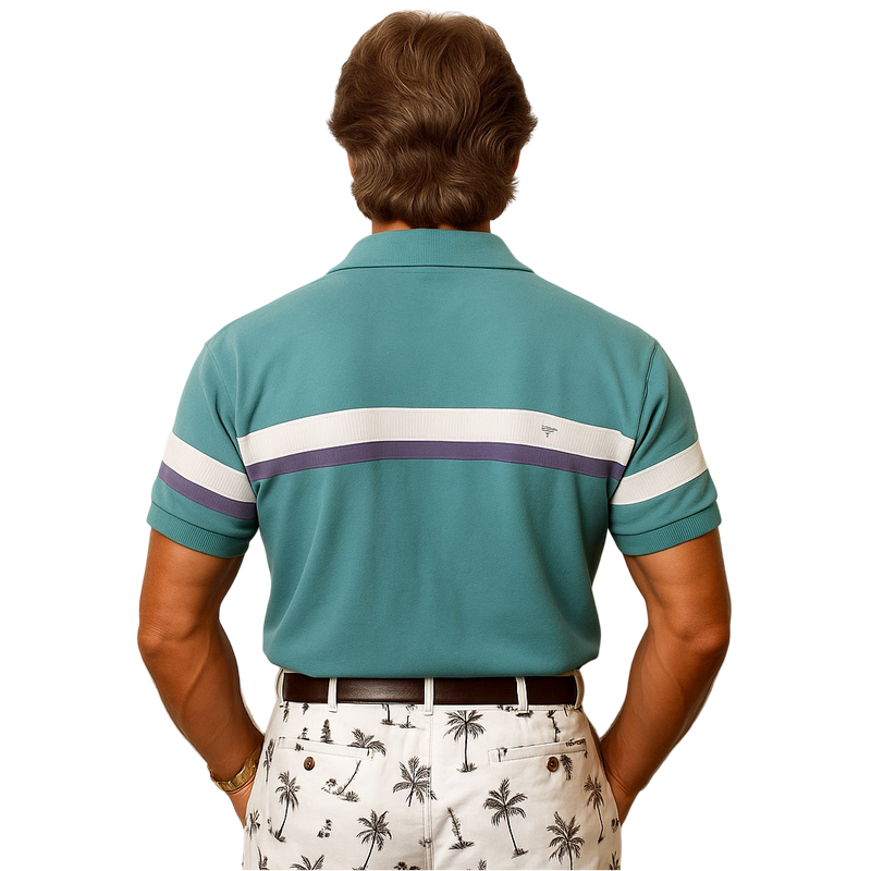 Courmayeur Stripe polo – a crisp teal short-sleeve pullover with retro ribbing and contrast piping, designed for après-ski drinks under Swiss chalet heat lamps. Bold enough for the slopes, breezy enough for al fresco raclette.
