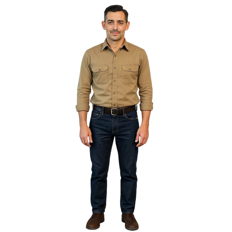 The Gasoline Alley Workshirt – a sandy twill utility button-down with twin flap pockets and a collar that’s seen sun, grease, and long American highways.