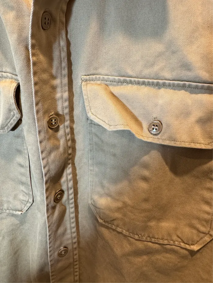 An authentic military khaki overshirt with embroidered chevrons, perfect for coffee-fueled rehearsals or late-night strategy talks in smoky green rooms.