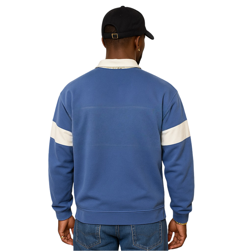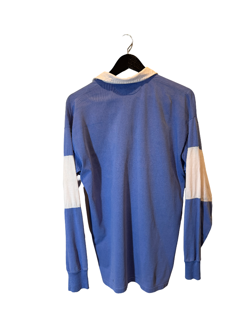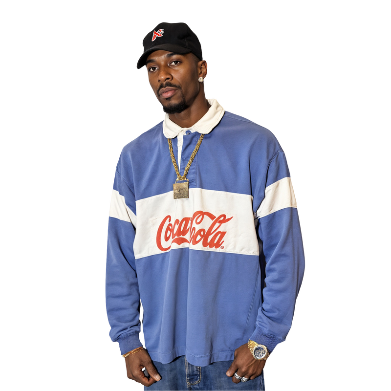 Cola Club Rugby – a blue and cream Coca-Cola rugby with bold branding and wide stripes, a rare relic of brandwear-meets-streetwear. Once owned by hip-hop icon Marcus 'Mack' Carter (check his closet), he wore it for press runs and neighborhood cookouts alike.