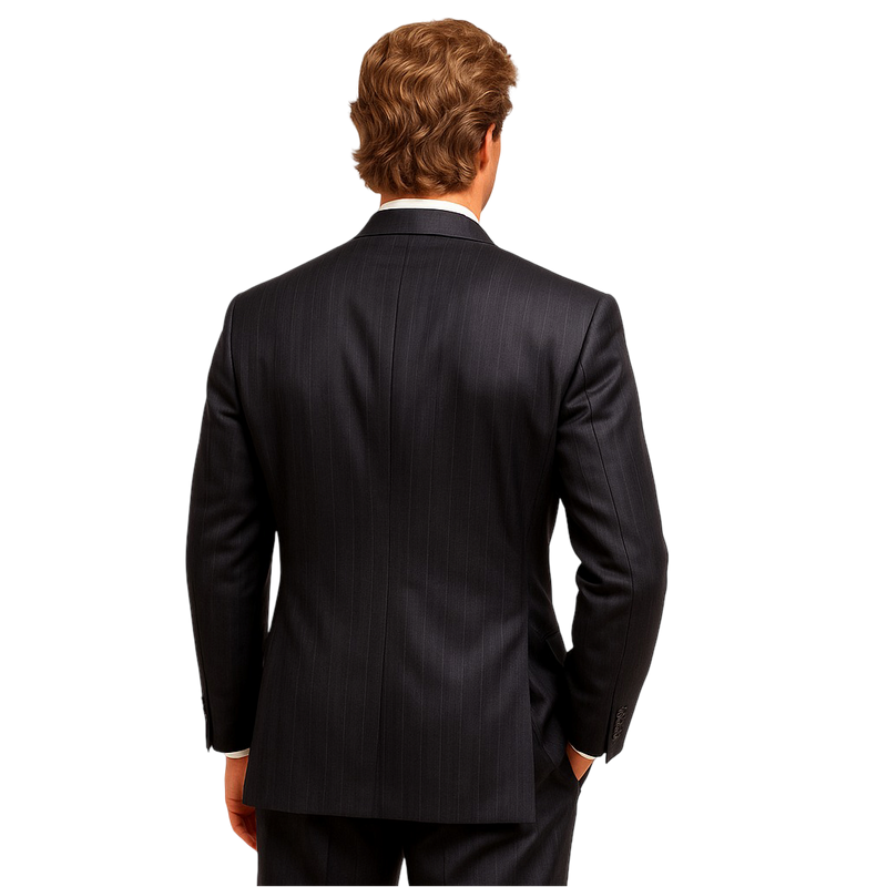 Waldorf Double Jacket– Commanding and cut with gravitas, this navy-striped double-breasted jacket was Vic Langley’s go-to for black tie panels, festival awards, and late-night boardroom victories.