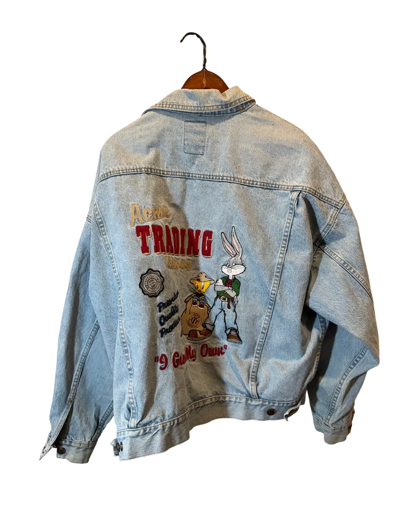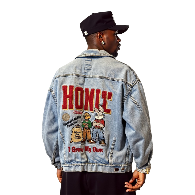 Homie Grown Denim Jacket – a baggy fit vintage jean jacket with Bugs Bunny embroidery and “I Grow My Own” slogan, part satire, part street-coded resistance. Once owned by hip-hop icon Marcus 'Mack' Carter (check his closet), it was his laugh-while-you-listen stage piece—worn during live sets and protest gigs. Condition Excellent. Minor vintage softening, graphic remains bold.