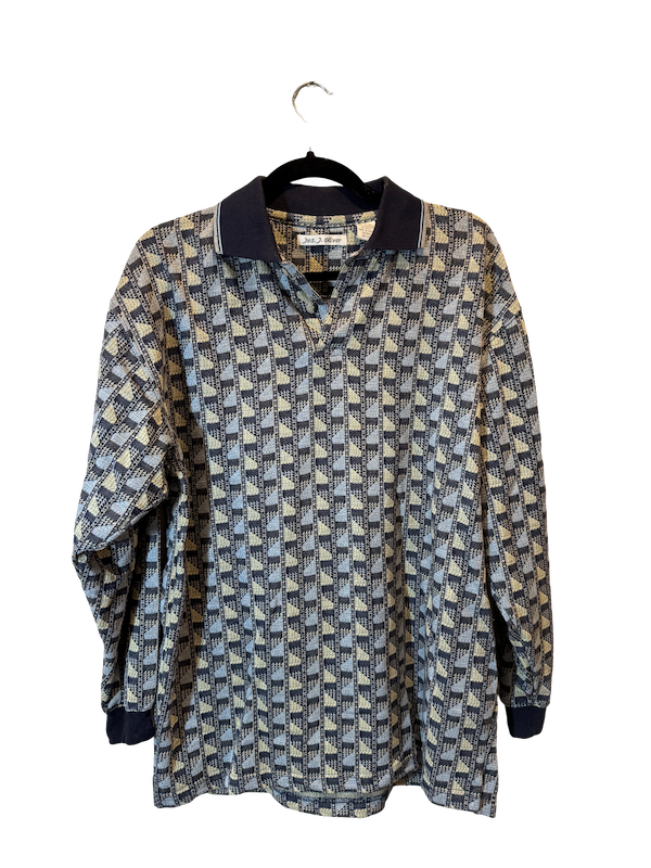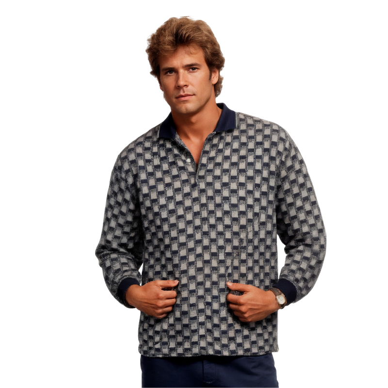 Cabrillo Sunset Polo – a soft-knit, Art Deco patterned long-sleeve polo fit for watching waves or flipping call sheets.