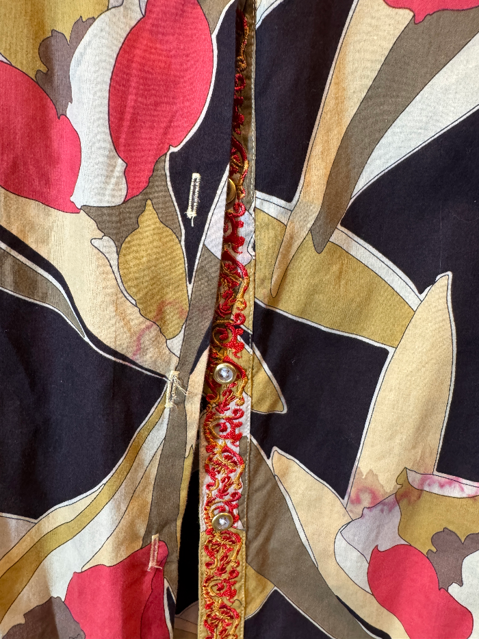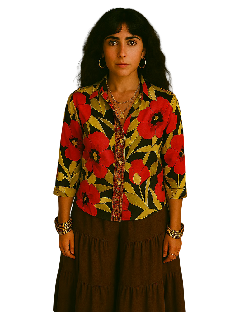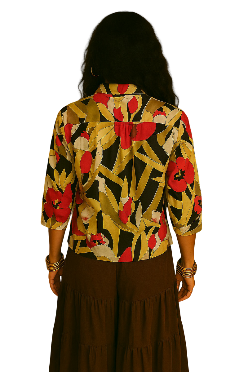 Tulip Mirage Blouse – a pop-art floral button-down in saffron, coral, and deep espresso, built for barefoot parties and layered road poems. The print dances between jungle and abstraction—meant for sun chasers and story keepers.