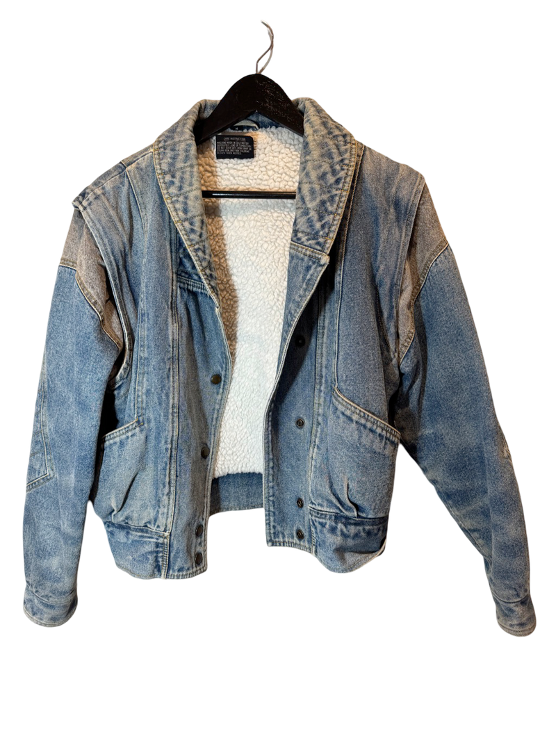 Likely 100% cotton denim with synthetic sherpa lining. Sourced and revived in the USA.