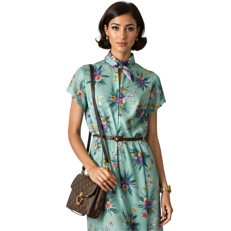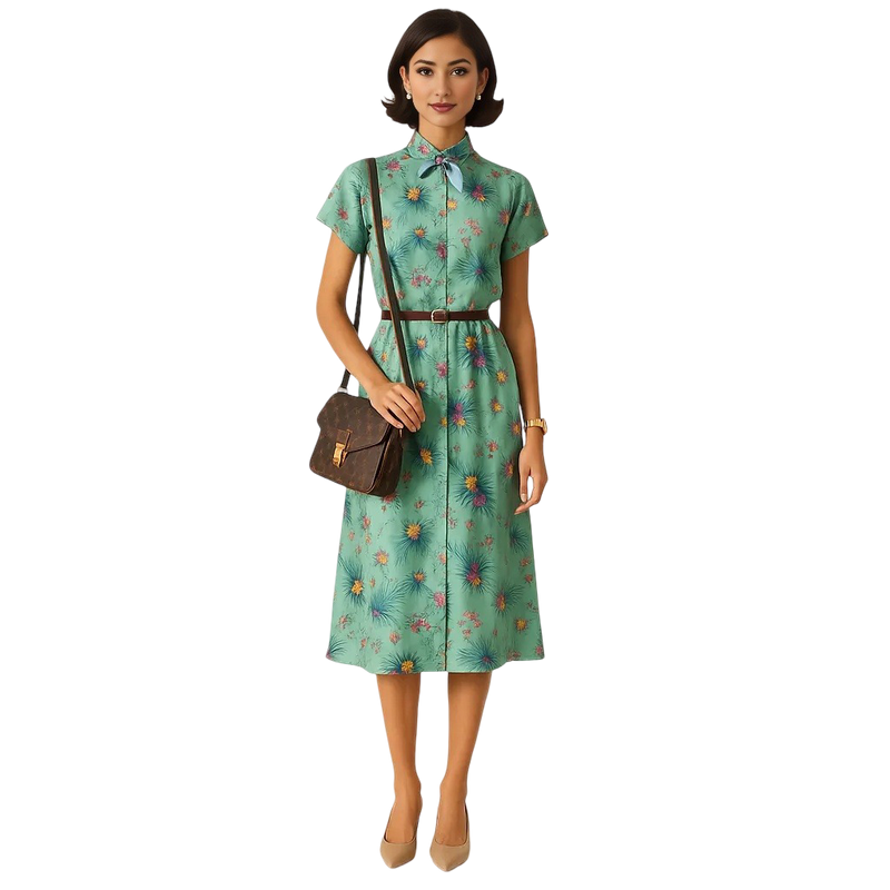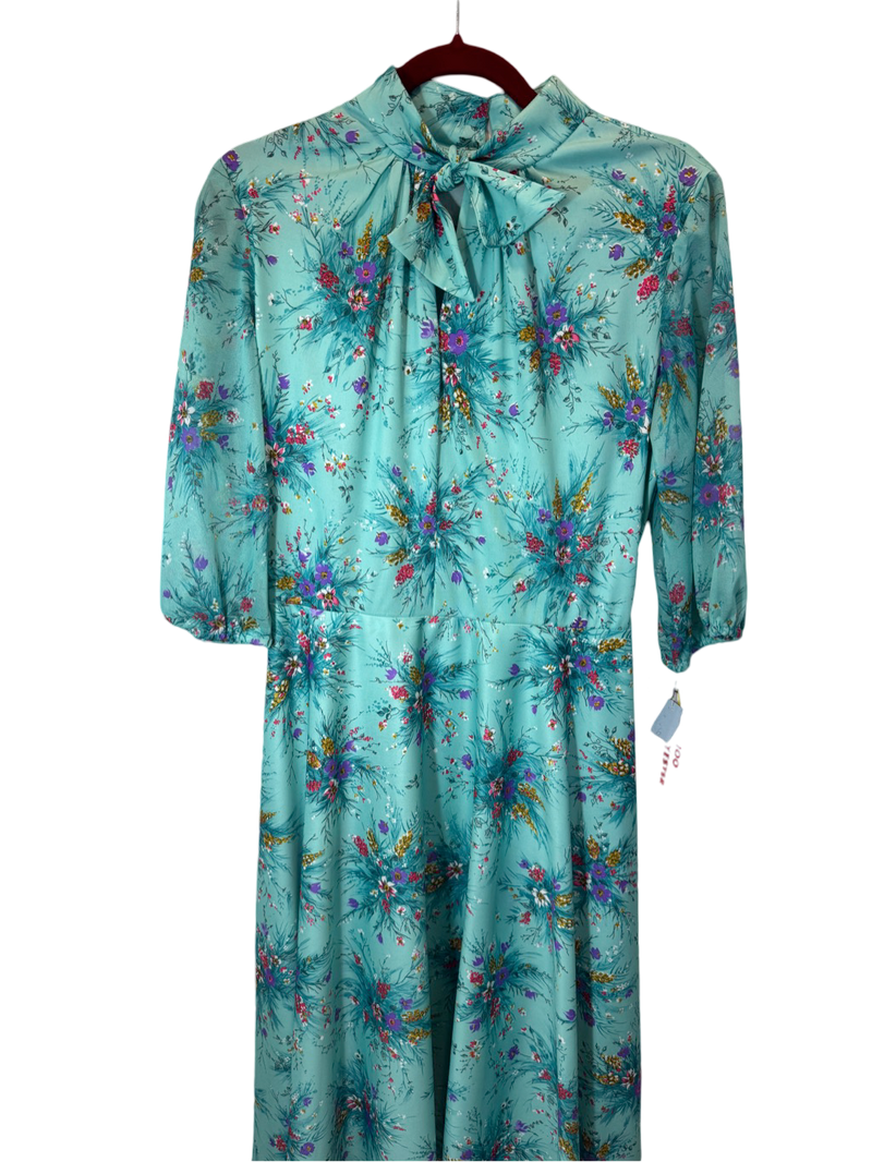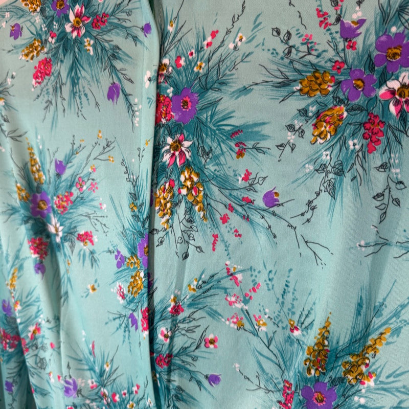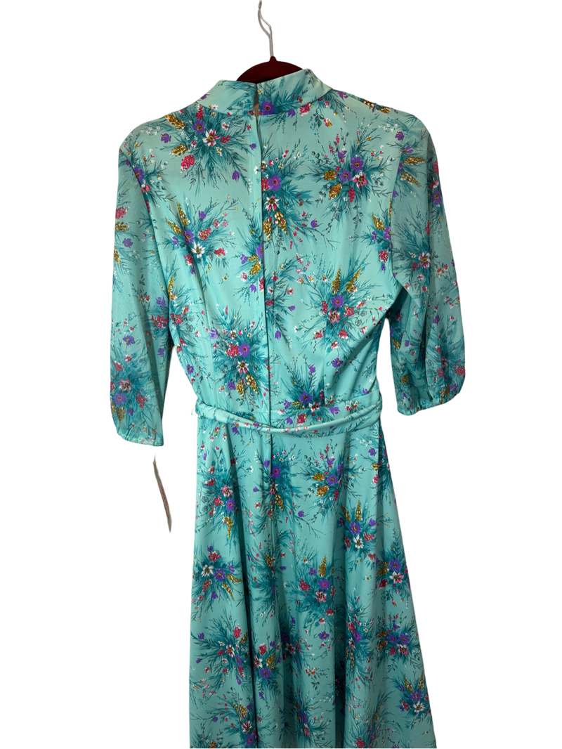 Monte Carlo Garden Dress – a new-with-tags aqua floral maxi from the 1970s, perfect for strolling botanical terraces or sipping Bellinis beneath striped cabanas.