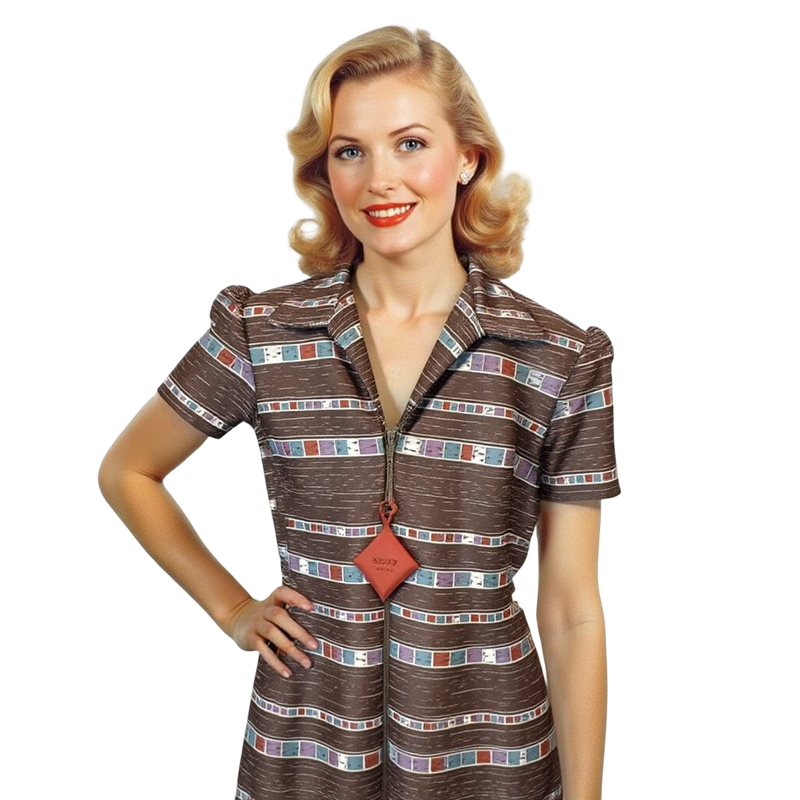 Checkerboard Sunday Zip Dress – a crisply tailored 1960s day dress in chocolate brown with woven stripe detail and contrast accents, complete with a bold red zipper pull for a touch of flair. Built for coffee klatches, school pickups, and weeknight casseroles—with pockets that mean business.