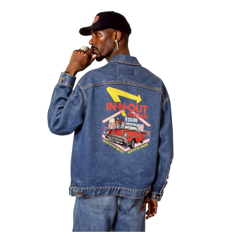 In-N-Out 45 Jacket – this 1993 limited denim piece celebrates 45 years of fast food legend, embroidered with West Coast flair and old-school car culture vibes.