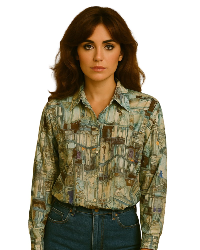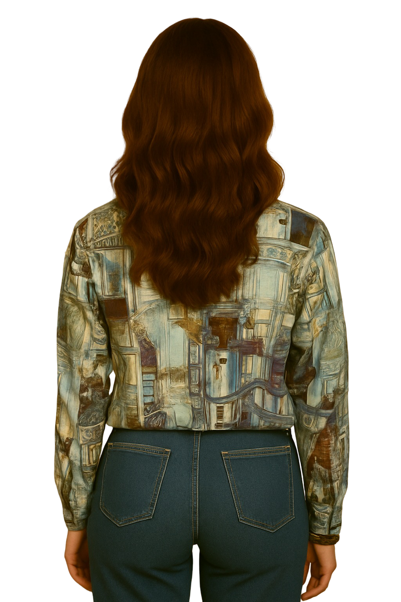 Versailles Mirage Shirt – a silky long-sleeve printed with decadent palace interiors, chandeliered salons, and rococo daydreams in seafoam, lilac, and gold. A shirt that blurs fantasy and finery—equal parts art history and lounge mysticism.