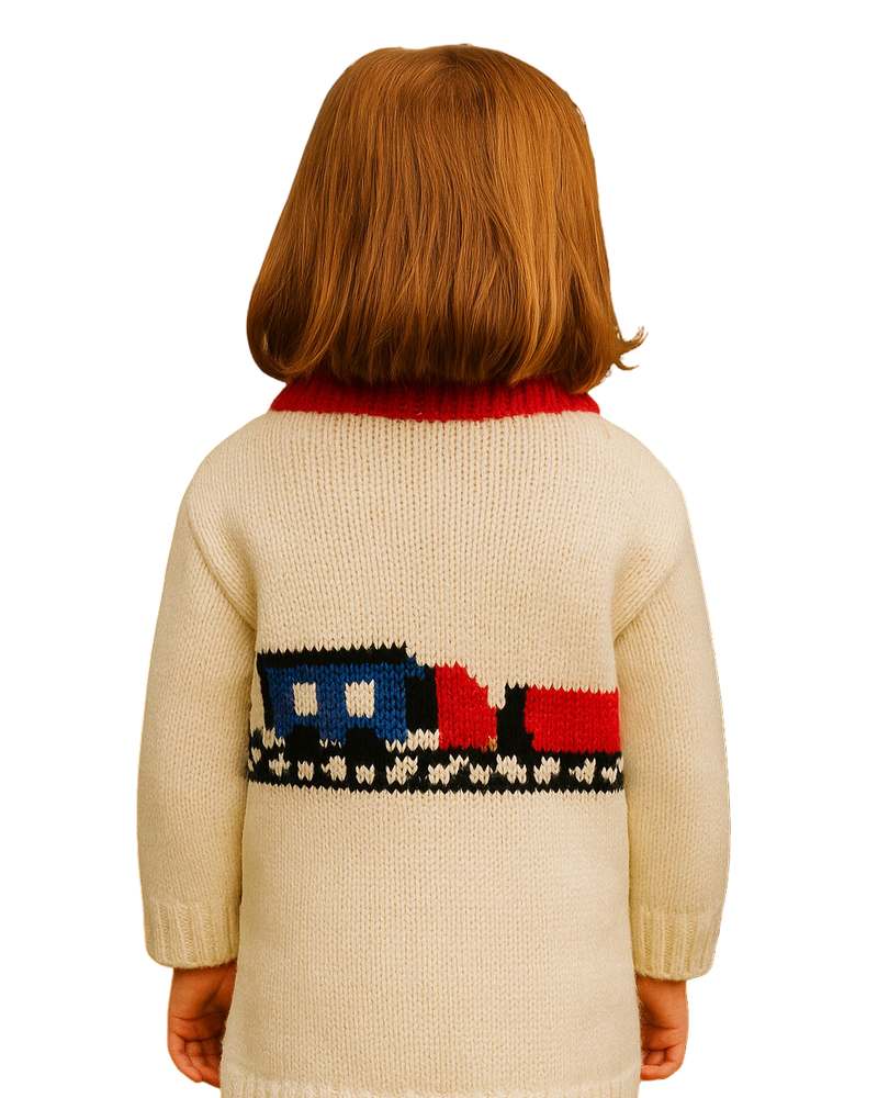 The Locomotion Pullover – A knit tribute to the golden age of train travel and tiny imaginations. This ivory crewneck is patterned with a classic choo-choo across the chest, puffing its way through story time and block towers. Red piping at the neckline and a sweet yellow engine badge give it that extra caboose charm—perfect for a junior conductor with a love for whistles and warm cocoa.