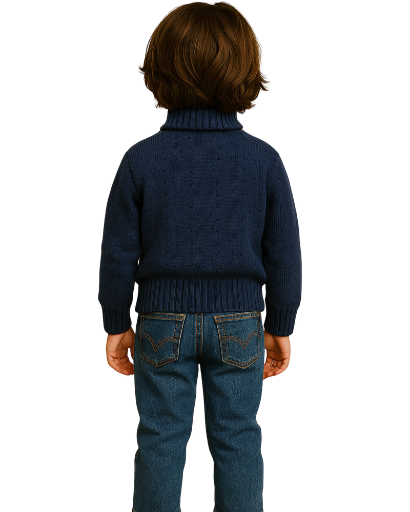 The Langley Marina Pullover – A deep-sea navy knit destined for foggy coastal walks and apple cider afternoons on the dock. The chunky cable-knit body and ribbed turtleneck keep the chill at bay, while the tailored length keeps it neatly tucked or effortlessly slouchy. It’s easy to picture this layered under a pea coat as Victor Langley’s youngest helped rig sails off Sag Harbor.