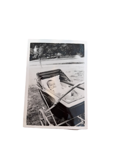 Pram Days Under Elmshade – a soft-focus black and white portrait of a baby nestled in a stately vintage pram, wheels poised on a sun-dappled lawn, likely 1950s. A quiet scene of postwar suburbia, where baby powder met fresh-cut grass and summer breezes cooled over cotton bonnets.