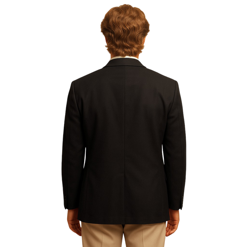 Likely a lightweight wool or poly-wool blend. Partially lined. Structured lapels with minimal padding. Smooth inner seams.