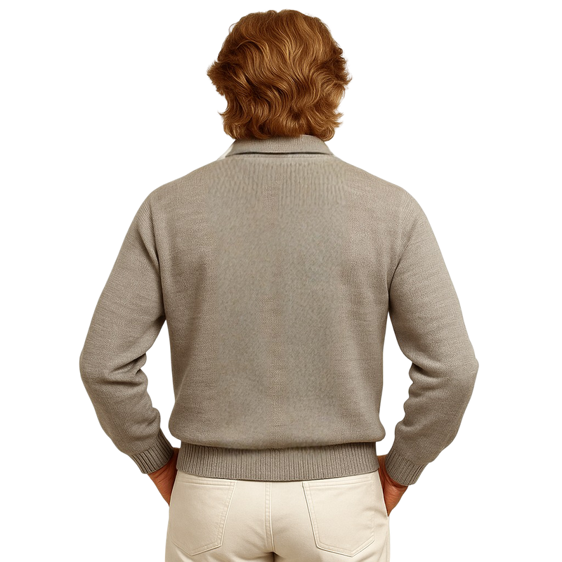 Leonardo Strassi Sunset Knit – a sandy-toned button-up with golden ochre racing stripes, this midweight knit is pure West Coast polish. With its open collar and textured weave, it balances between boardwalk leisure and studio backlot cool. This is a collector's item from rare Leonardo Strassi brand