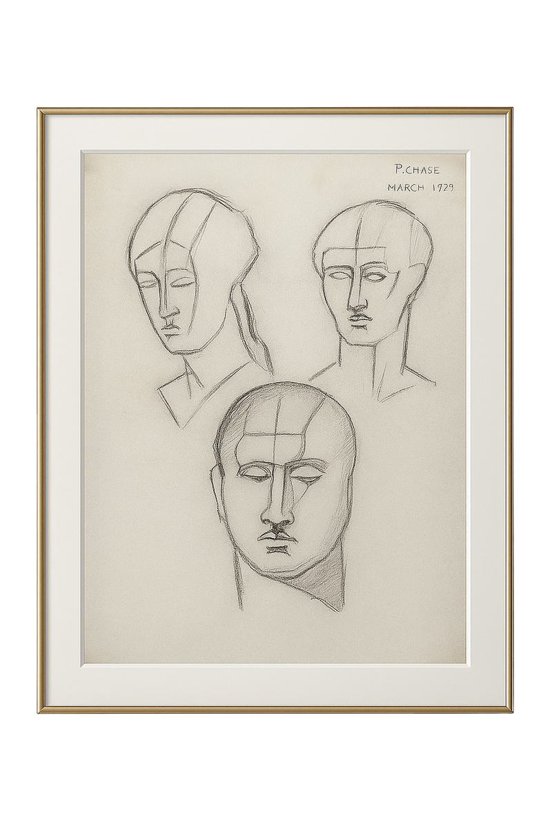 Three schematic head studies examine facial proportions through simplified planar breakdowns. These analytical constructions were core to early 20th-century academic training, distilling complex forms into essential geometry. A practical yet expressive exercise in visual logic.