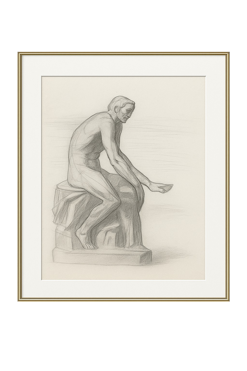 A study of a classical male figure seated on a stone plinth, arm extended in a gesture of giving. The balance between anatomical volume and architectural solidity creates a sculptural presence. Elegant curvature in the spine contrasts with the angularity of the support base.