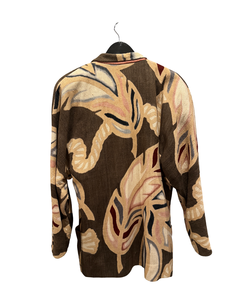 Feather Oracle Jacket – a weightless, open-weave blazer in a desert-bloom palette of sienna, clay, and blush. With sweeping abstract florals and feathered curves, this piece moves like wind through linen curtains in a Riad lounge.