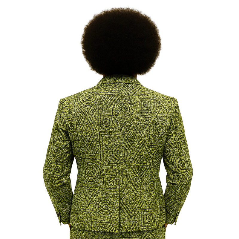 Electric Slide Blazer – a chartreuse showstopper lit with hypnotic black linework in a geometric maze, made for strobes, soul train lines, and late-night lounge encores.