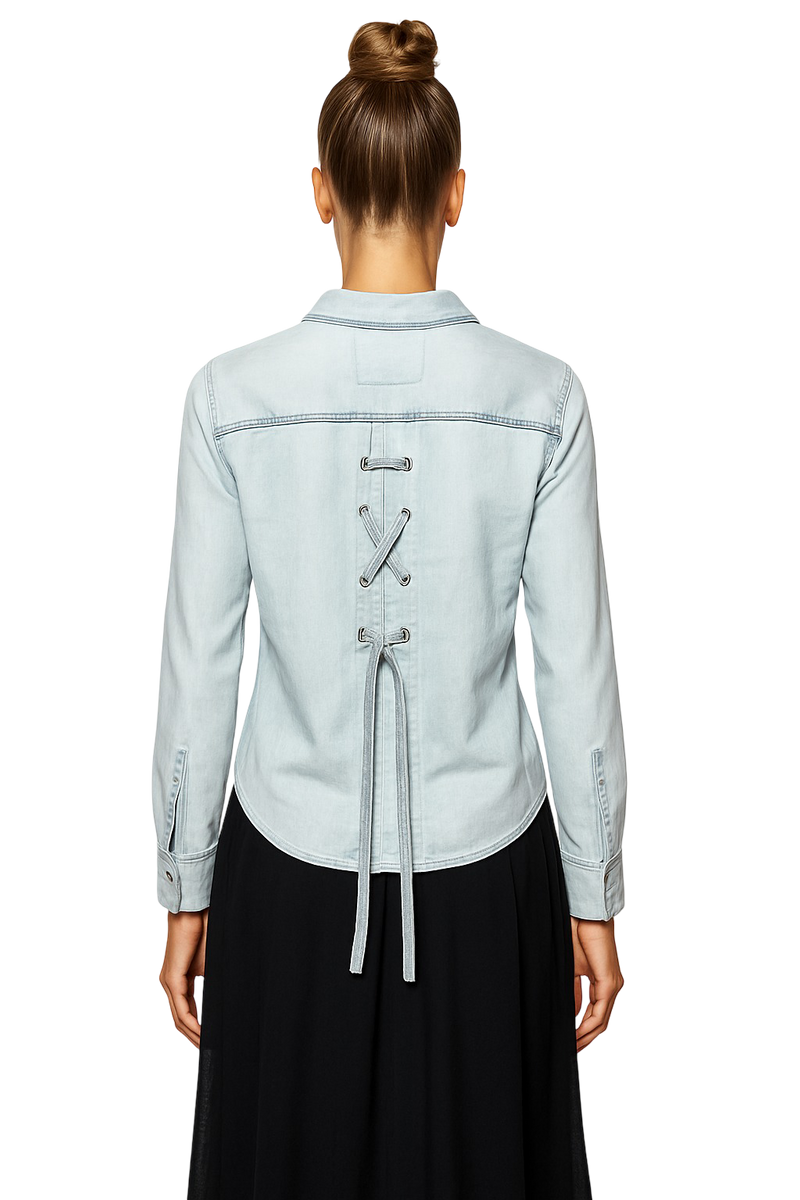 Bleu d’Atelier Snap Shirt – a soft-washed chambray classic with a crisp collar and silver snap buttons, channeling the easy confidence of French model-off-duty looks and minimalist studio sessions.
