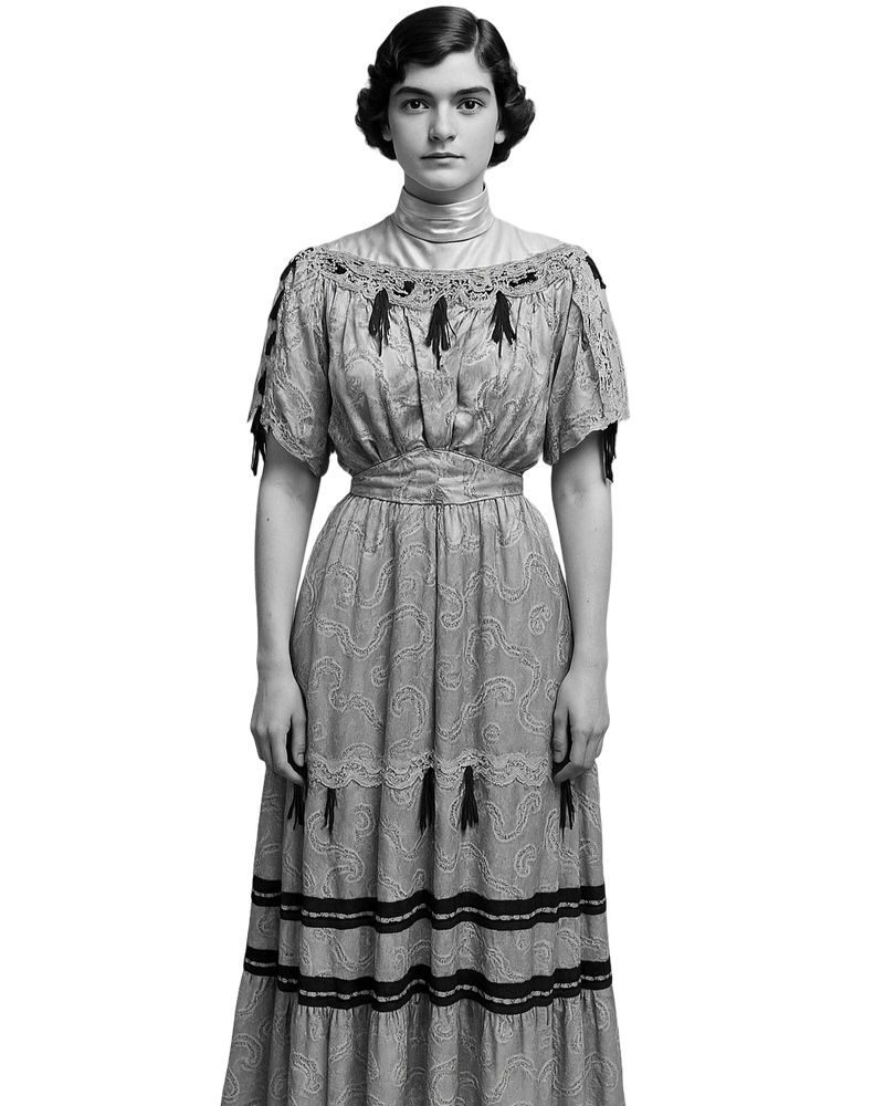 Cotton-lace blend with satin collar. Hand-finished construction typical of early 1900s garment-making.