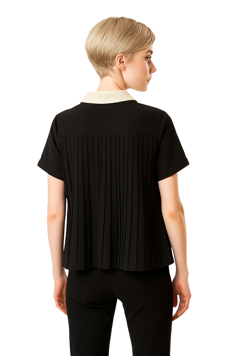 Camden Cate Blouse – a sharply pleated black button-up with a soft ivory Peter Pan collar, perfect for beat poetry nights, Carnaby Street prowls, and tapping your toes at basement jazz sets.
